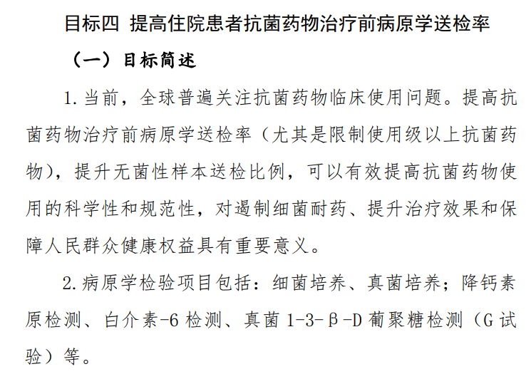 国家卫生健康委办公厅关于印发《2021年国家医疗质量安全改进目标的通知》中目标四提出 “ 提高住院患者抗菌药物治疗前病原学 ”