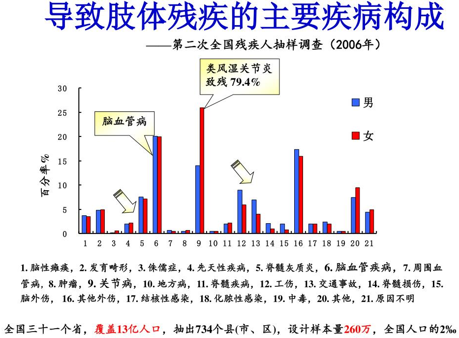 美日患病率分别为3.0%和0.3%,我国RA患病率在0.28~0.45之间,目前我国有近500万的RA患者,类风湿关节炎致残率79.4%。