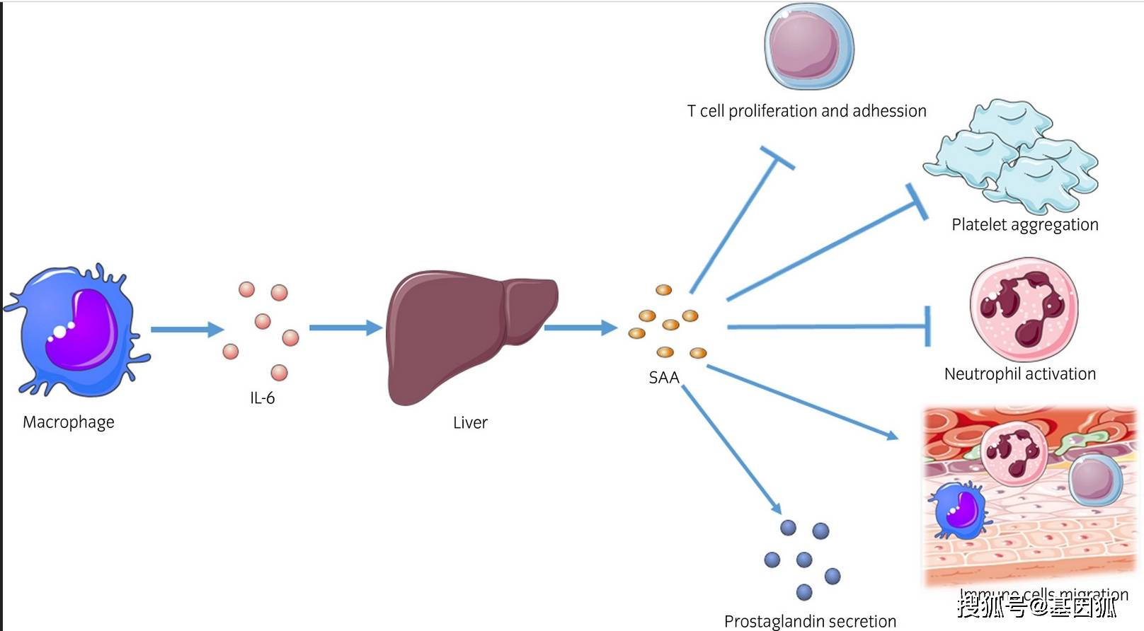 血清淀粉样蛋白A是一种急性时相反应蛋白,其数值通常与感染程度呈正相关。用以评估急性相反应进程。SAA是个灵敏的参数,它在炎性反应大约8h后开始升高,且超过参考范围上限时间早于CRP,然而CRP在正常人中的中位数值与参考范围上限的差距,大约有10倍。在SAA中仅有5倍。轻微感染,例如,许多病毒感染,SAA升高要比CRP更为常见。