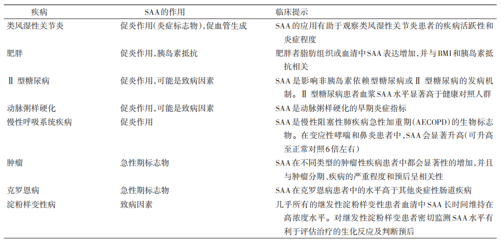 在类风湿性关节炎患者中SAA的应用有助于观察疾病活跃性和炎症的程度。在肥胖人群中,SAA主要发挥促炎和胰岛素抵抗作用。SAA也参与了动脉粥样硬化的致病机制,在