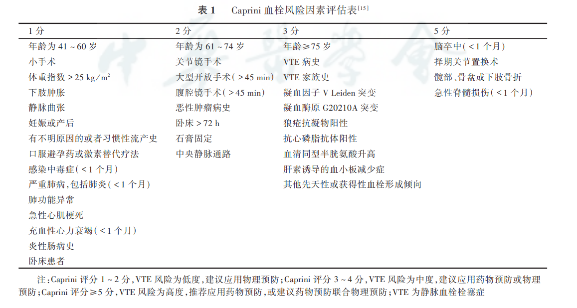 Caprini 评分表的评分项目涵盖了内科、外科患者特征,危险因素较全面,实施方案更细致,比较能体现个体化预防的特点,除适用于外科手术患者VTE风险评估外,也是可用于综合医院所有住院患者的VTE风险评估。