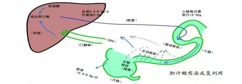 CG正常代谢途径为肝—肠循环,经毛细胆管、胆管排入胆囊,随同胆汁进入十二指肠,帮助食物消化。95%胆酸在回肠末端重吸收,经门静脉再回肝脏,由肝细胞摄取再利用。