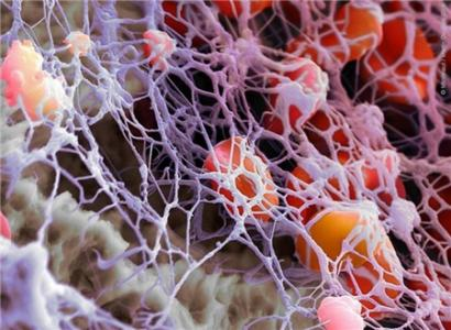 血管破损我就准备来修补血管啦,经过凝血瀑布(你记不住没关系)的层层审批流程,形成了结实的纤维蛋白网,网住血细胞成为血栓,血栓堵住破损处就修补完成啦。保护力满分!